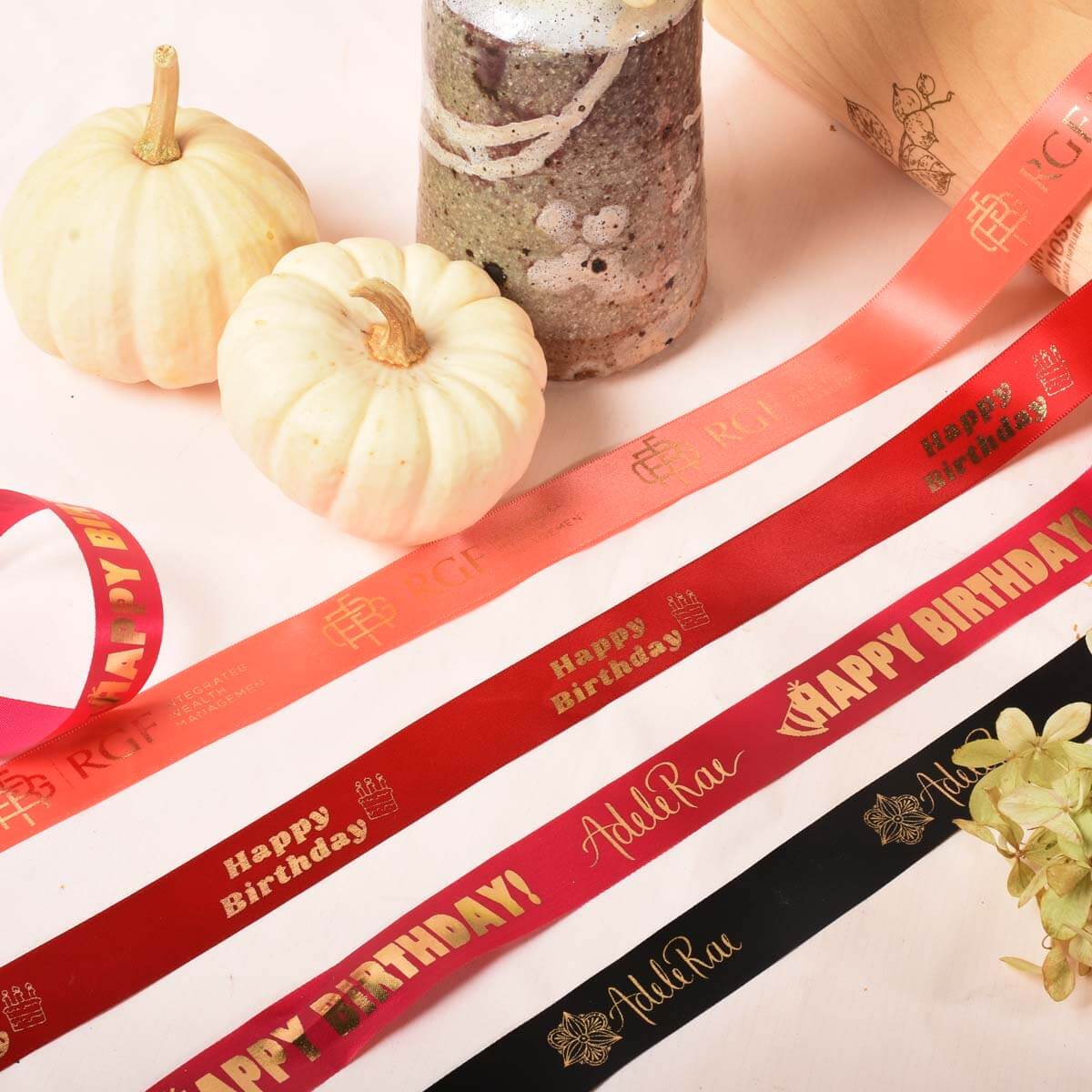 Améliorez votre expérience de cadeaux avec des rubans imprimés sur mesure d'Adele Rae Florists. Nos rubans exquis sont personnalisés grâce à des techniques d'estampage à chaud, ajoutant une touche d'élégance à votre produit. Partagez votre logo, vos graphiques ou le message souhaité pour votre ruban et nous créerons jusqu'à trois options de conception uniques parmi lesquelles vous pourrez choisir. Ce ruban mesure 1 pouce de largeur et la quantité minimale est de 50 mètres. Rendez vos cadeaux vraiment spéciaux avec nos rubans personnalisés.