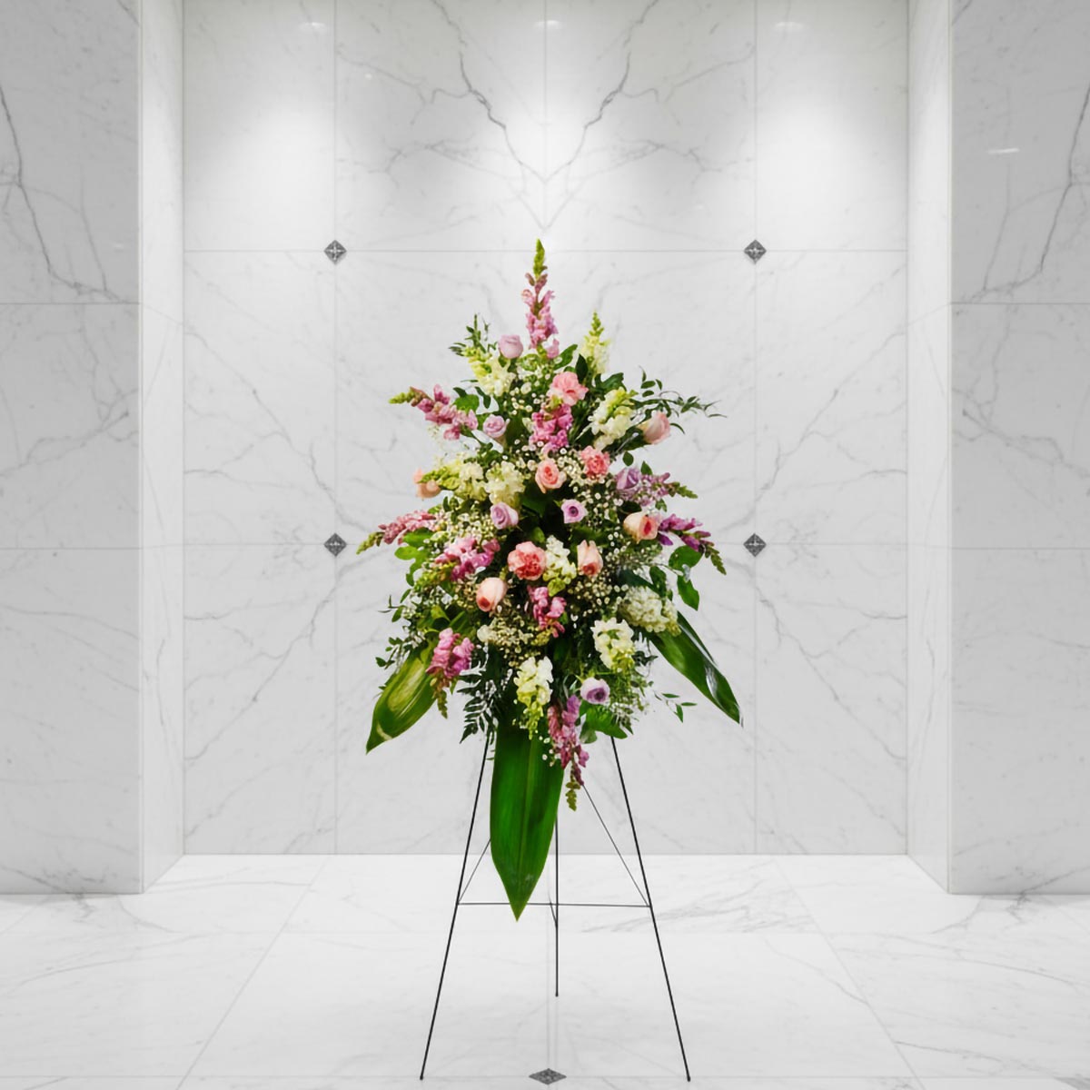 Offer a message of gentle serenity with the Farewell Standing Spray, a beautiful funeral flower arrangement designed to bring comfort during a difficult time. This elegant floral spray features soft-toned blooms like mauve snapdragons, white and cream stock, mauve and pink roses, delicate baby's breath, and lush greenery. Ideal for the service of a beloved lady, however, if you would like us to change colours we can do it.
