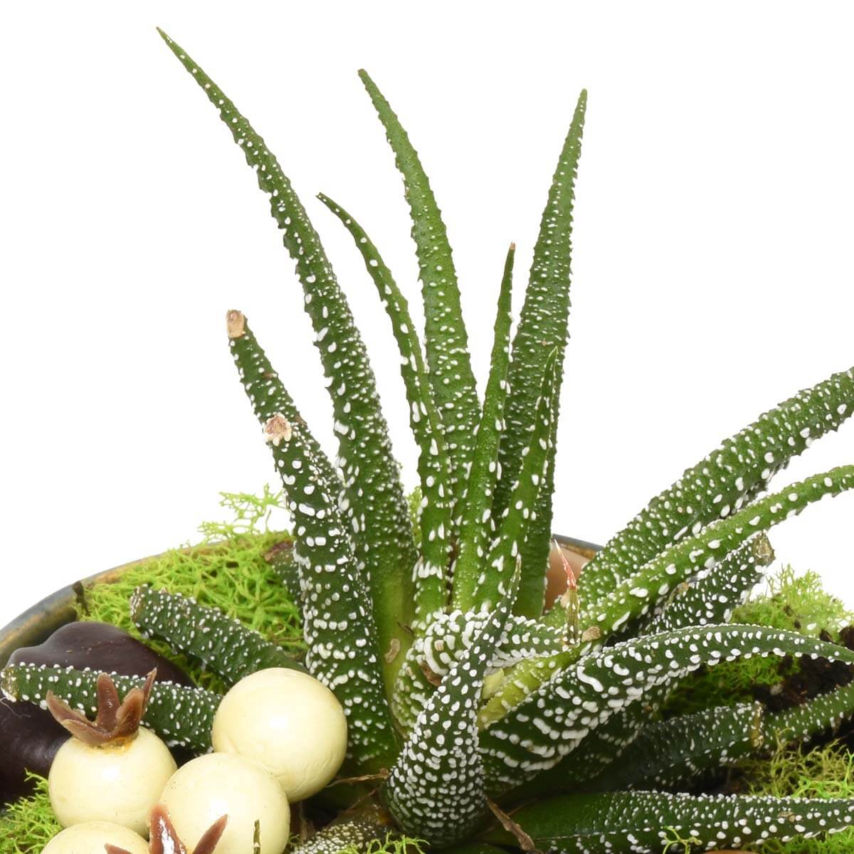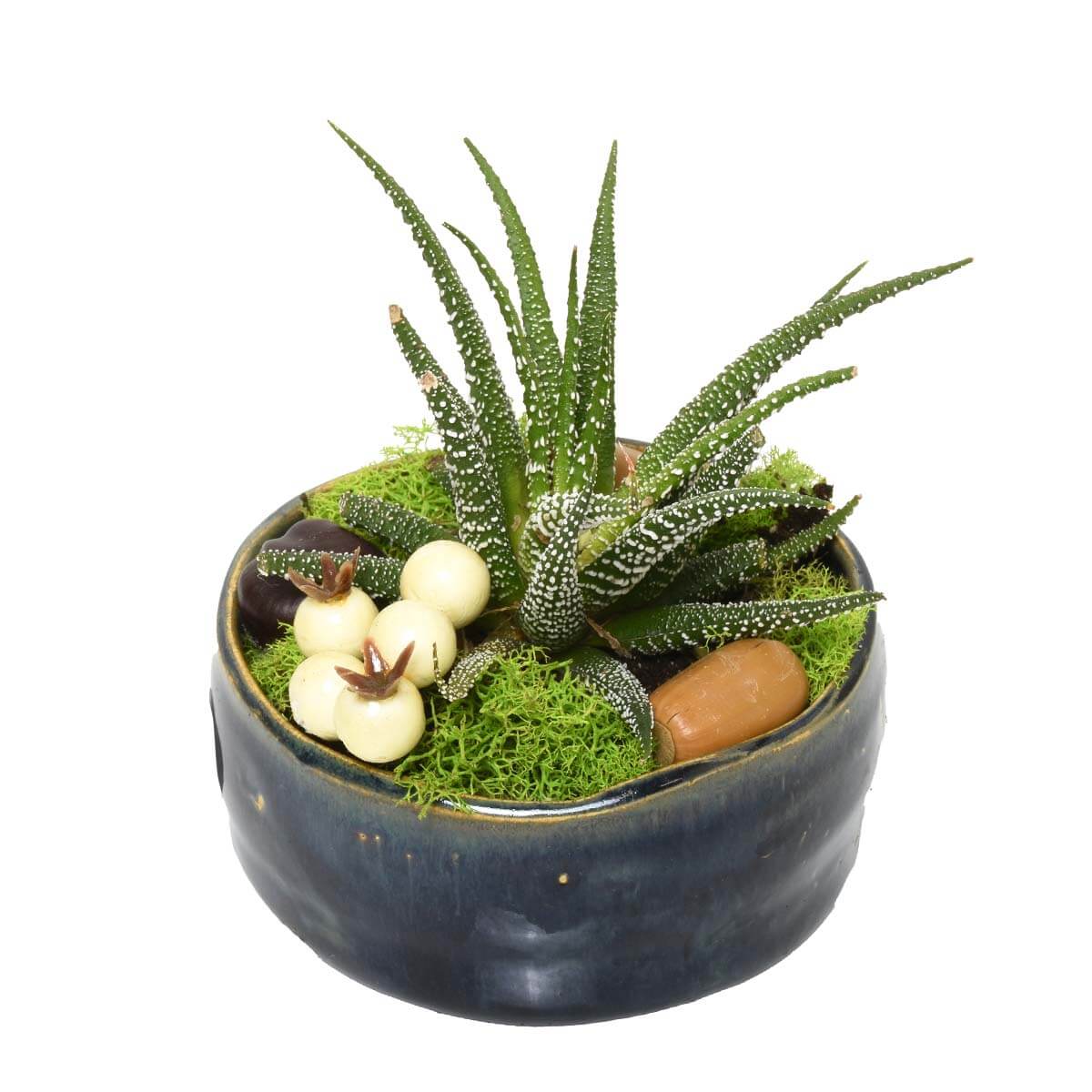 One of our featured designs is this beautiful succulent Haworthia plant in a ceramic bowl by local artist Nina Koba. The planter measures 4 x 4 inches, making it a perfect fit for any desk, shelf, or tabletop.