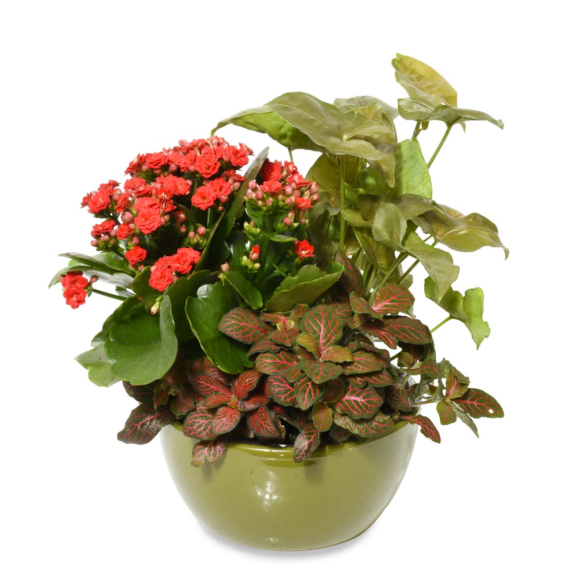 Celebrate her birthday with a burst of energy and color. This Vibrant Red Flowering Plant Garden is a stunning arrangement measuring 8 inches wide, designed to be a long-lasting and meaningful gift for a mom or aunt. Presented in a sleek green ceramic bowl, it combines various textures and rich hues that create an immediate focal point in any room.