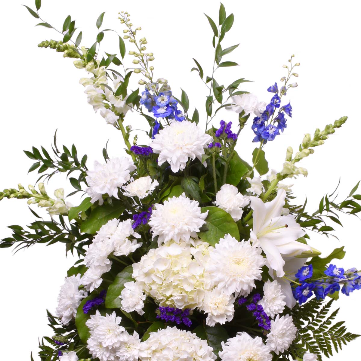 This funeral flower spray arrangement features a carefully curated selection of fresh flowers, including: