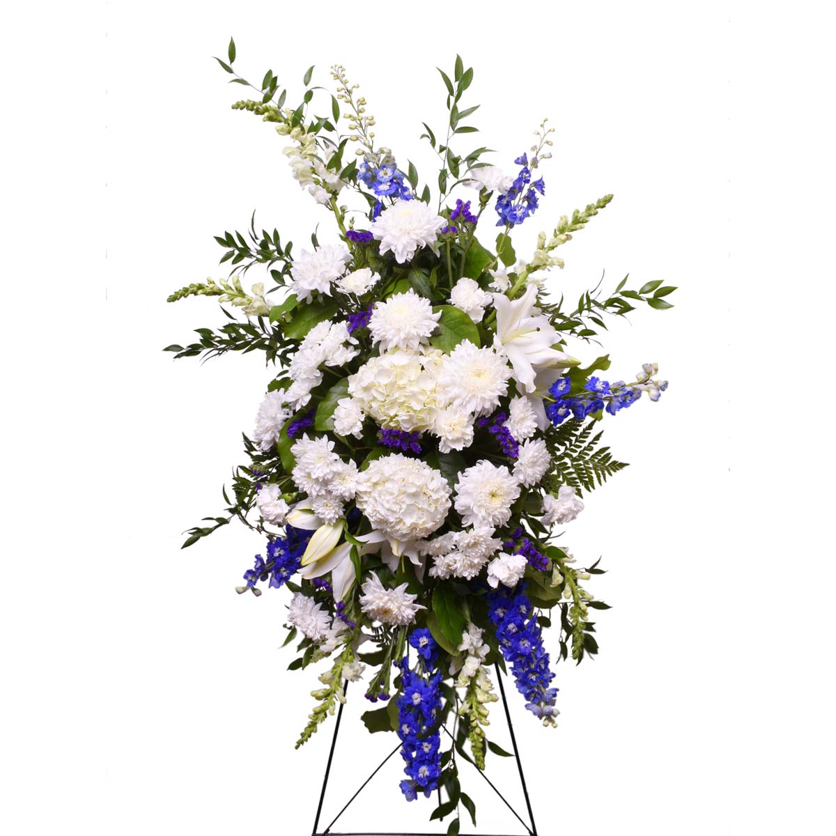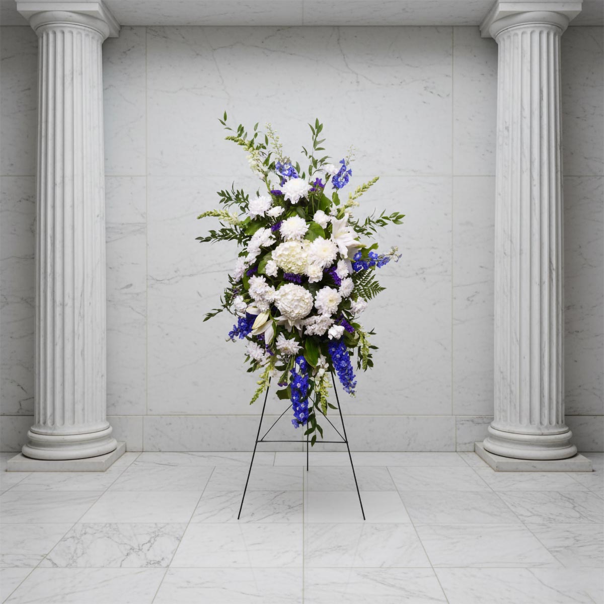 This funeral flower standing spray is a poignant tribute to a life well-lived. Standing approximately 65 inches tall (including the easel) and 24 inches wide, it commands attention with its vibrant colours and lush textures.