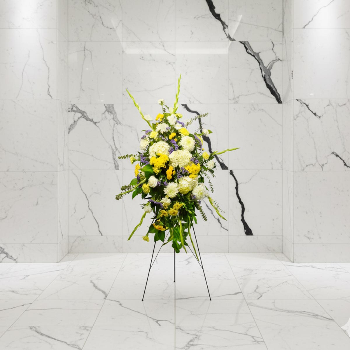Pay tribute with elegance. This beautifully crafted funeral standing spray is a timeless expression of sympathy. Featuring a thoughtful blend of roses, snapdragons, disbuds, ti leaves, ferns, gladiola, and aspidistra, this funeral flower arrangement offers a dignified and respectful tribute suitable for both men and women. Includes a 54-inch tall wire easel for easy display at the funeral service.