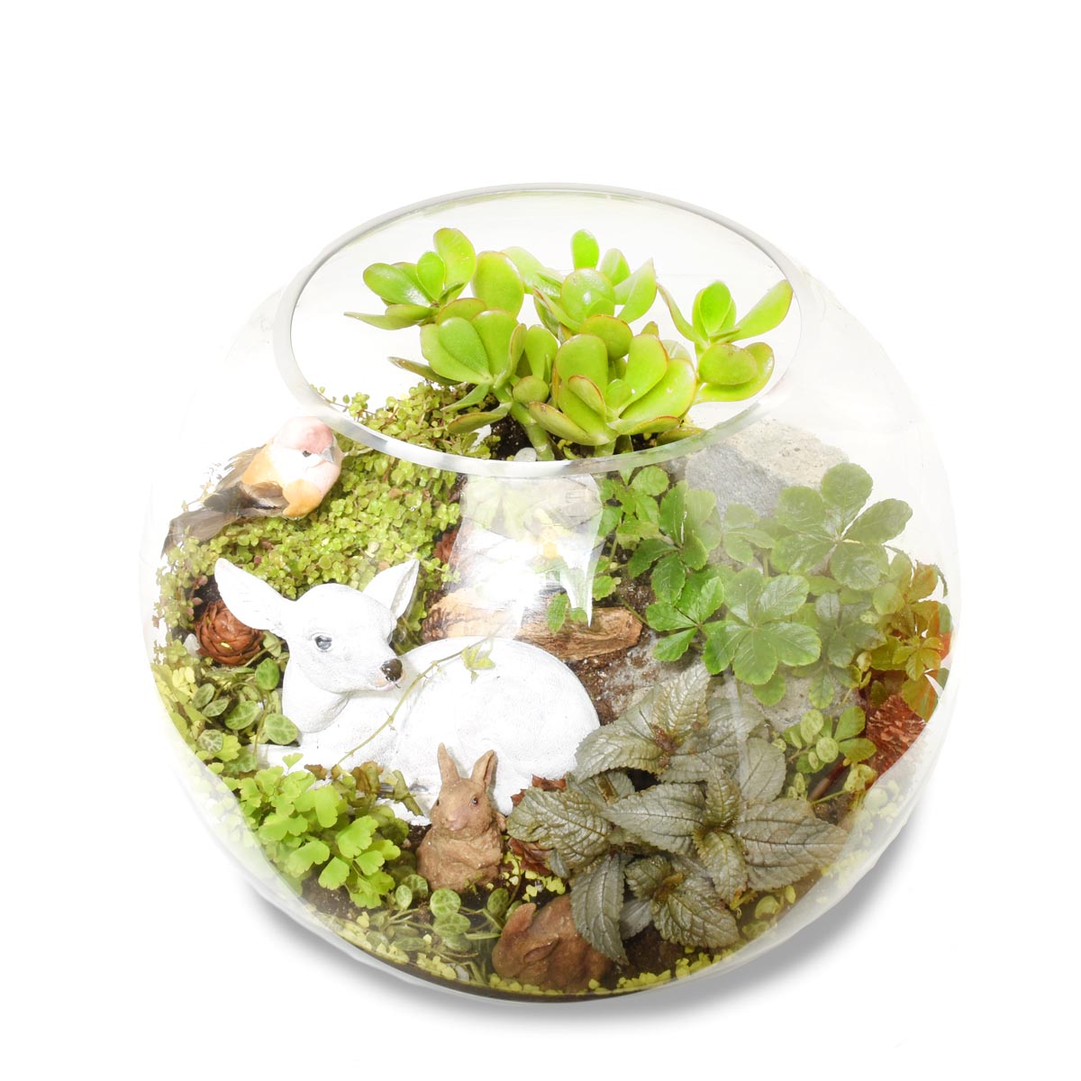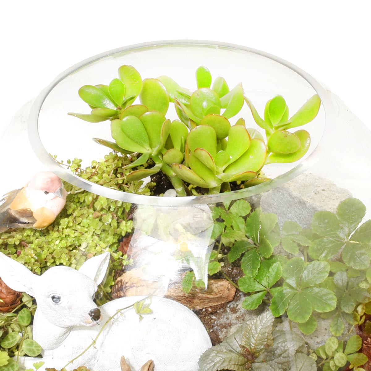 這款獨特的生態瓶置於優雅的圓形玻璃碗中,將易於養護的植物與令人愉悅的林地元素巧妙結合: