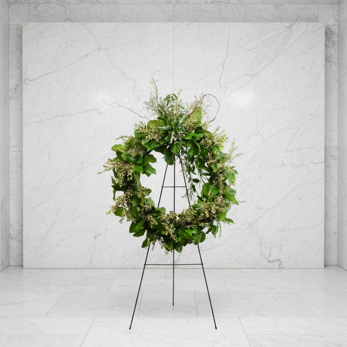 常青紀念花環以優雅簡約的方式,為您摯愛的親朋好友獻上永恆的紀念。花圈尺寸為24吋(如圖),完全由新鮮綠植精心製作,現代優雅的花圈以其簡約之美脫穎而出。精心附贈54吋高的金屬畫架,確保您真誠的情感得到突出而又充滿敬意的展現。