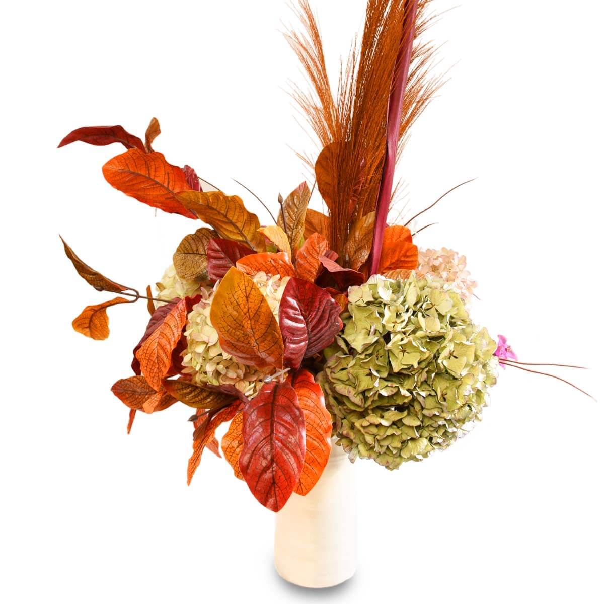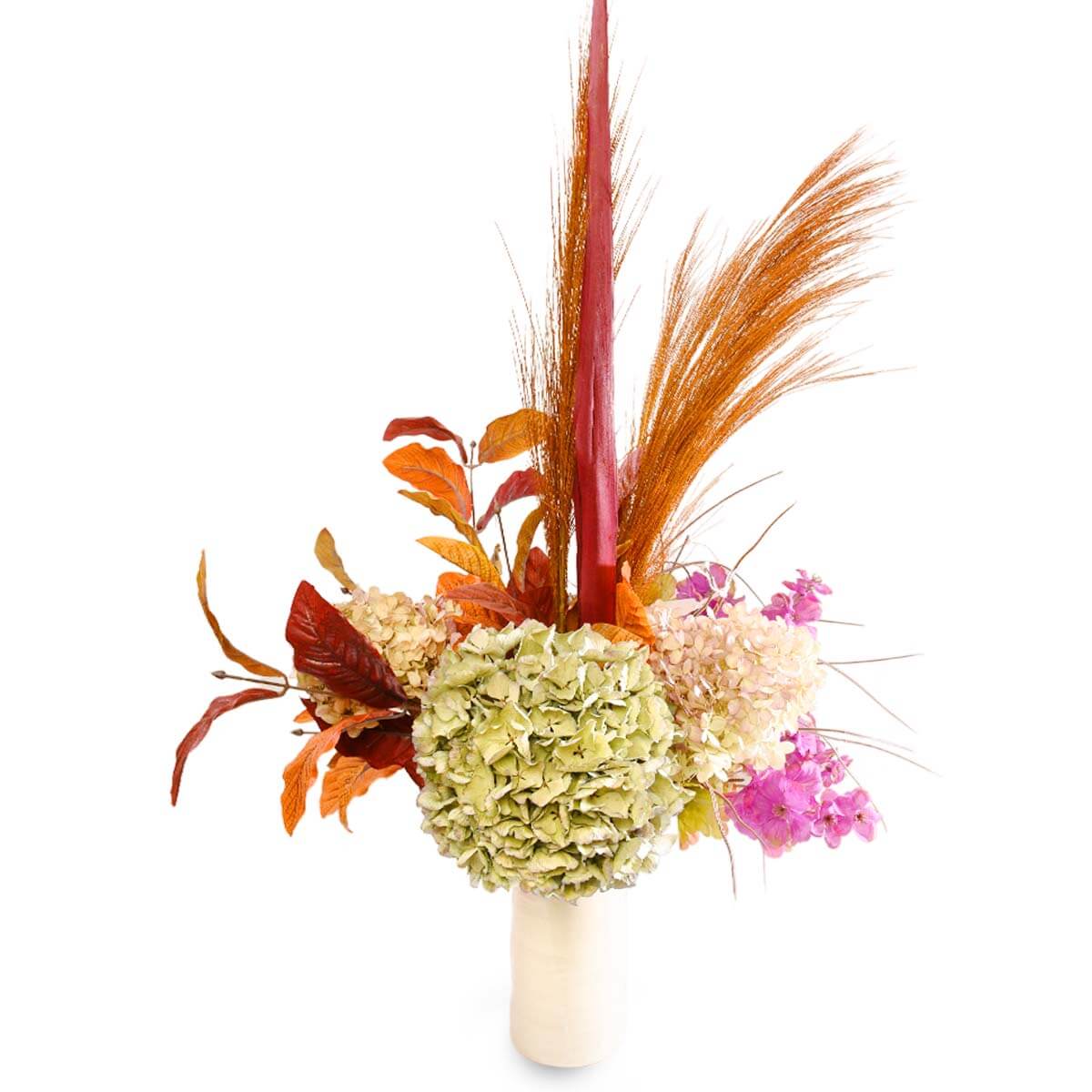 令人驚嘆且獨特的絲綢和乾燥花設計可裝飾您的家庭或辦公室,陶瓷花瓶包含在價格中。這件精美的花藝作品採用了各種優質絲綢和乾燥花,如乾繡球、枝葉等,排列成和諧而引人注目的構圖。這些花朵鑲嵌在白色陶瓷花瓶中,由當地花藝藝術家 Nina Koba 精心設計,她以簡約和現代的風格而聞名。花瓶表面光滑有光澤。