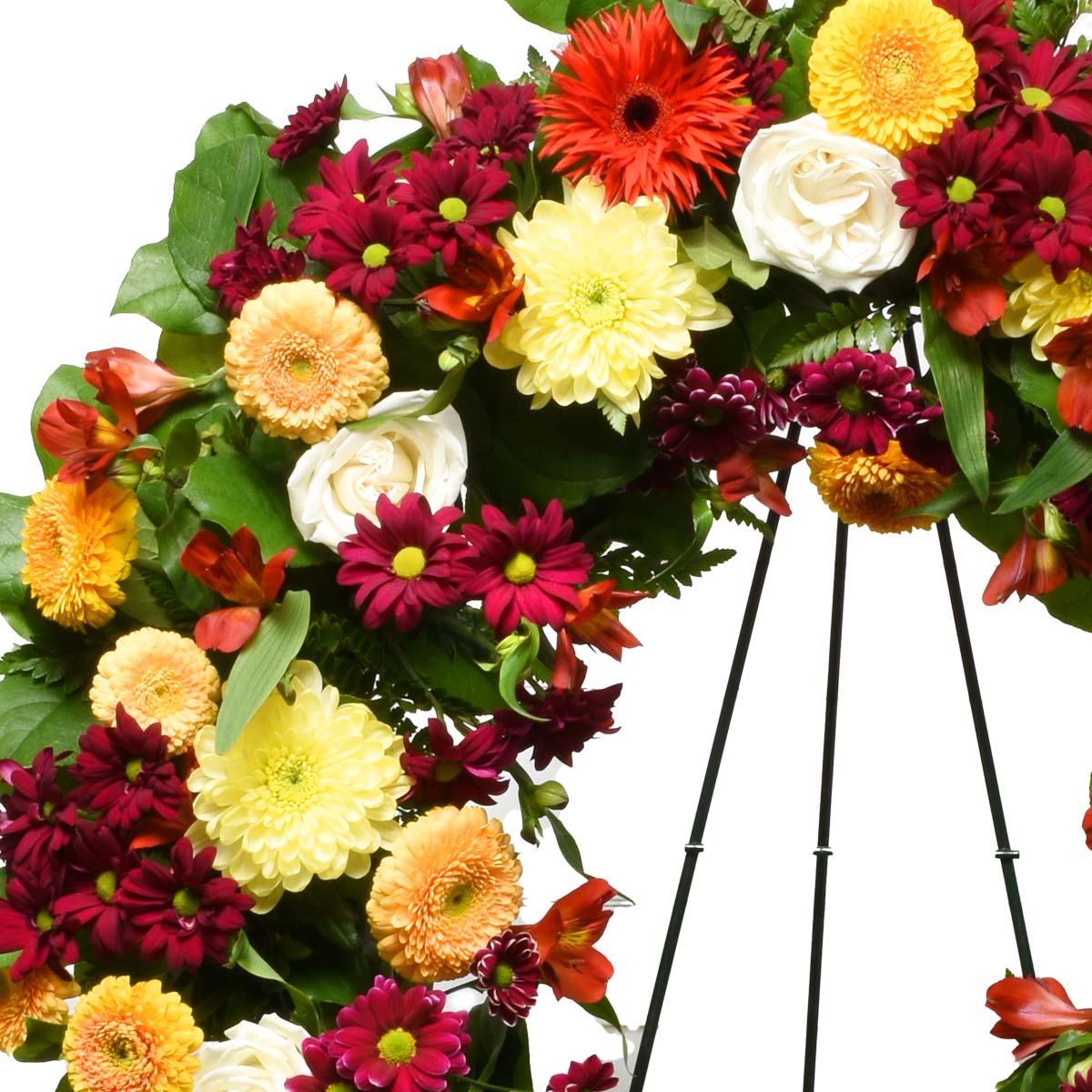 用我們優雅的紀念葬禮花圈表達您最深切的哀悼。這個精美的 24 英寸葬禮花圈是一個充滿活力而又令人感到安慰的致敬之物,以濃鬱、溫暖的橙色色調與柔和、溫和的白色和諧融合。每一朵花都經過精心挑選和排列,以創造持久的愛情和珍貴回憶的象徵。花圈放置在一個 54 英寸高的堅固金屬畫架上,為葬禮提供了莊嚴而突出的展示。包括非洲菊、菊花、玫瑰、百合水仙等花卉。適合男人或俗人的追思會。
